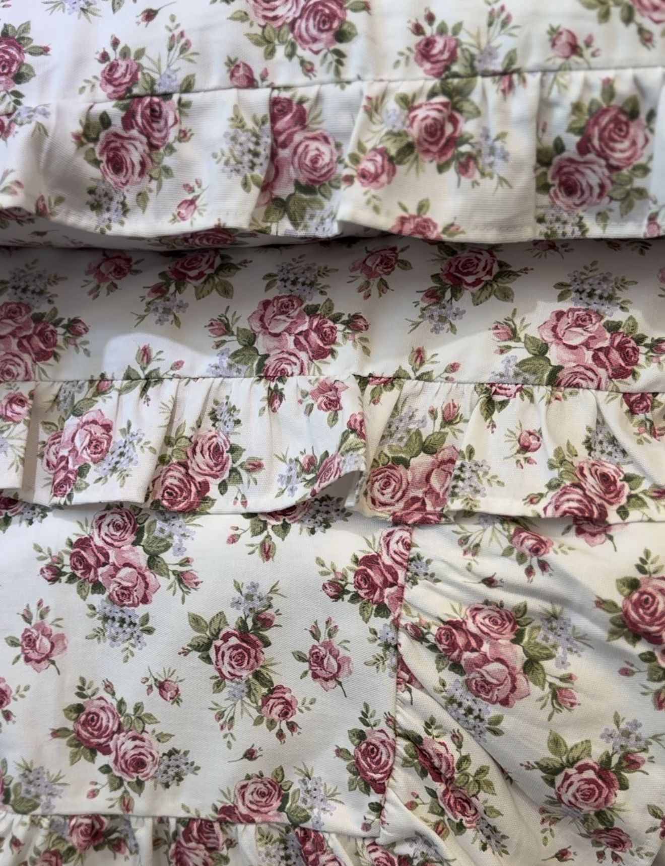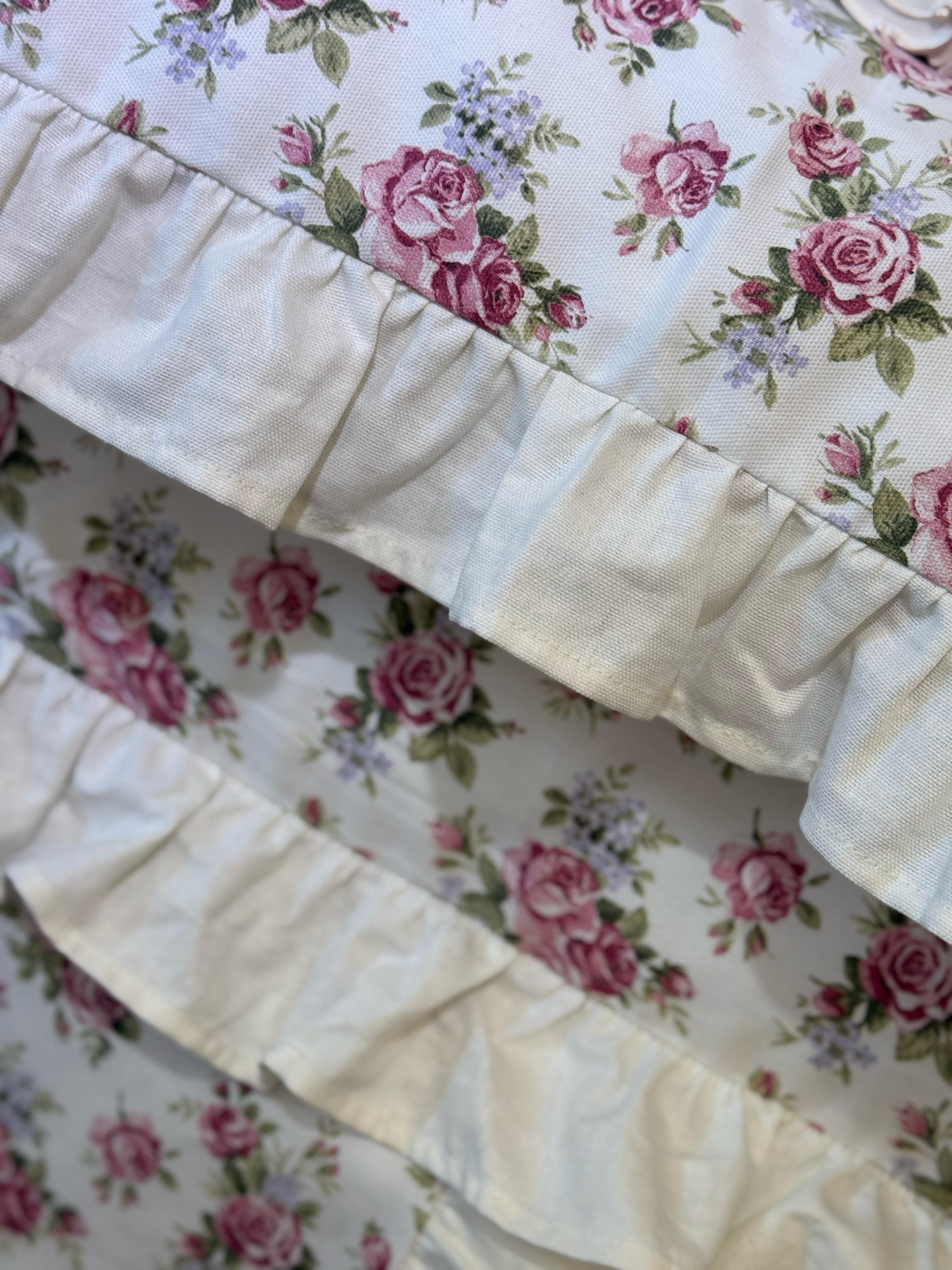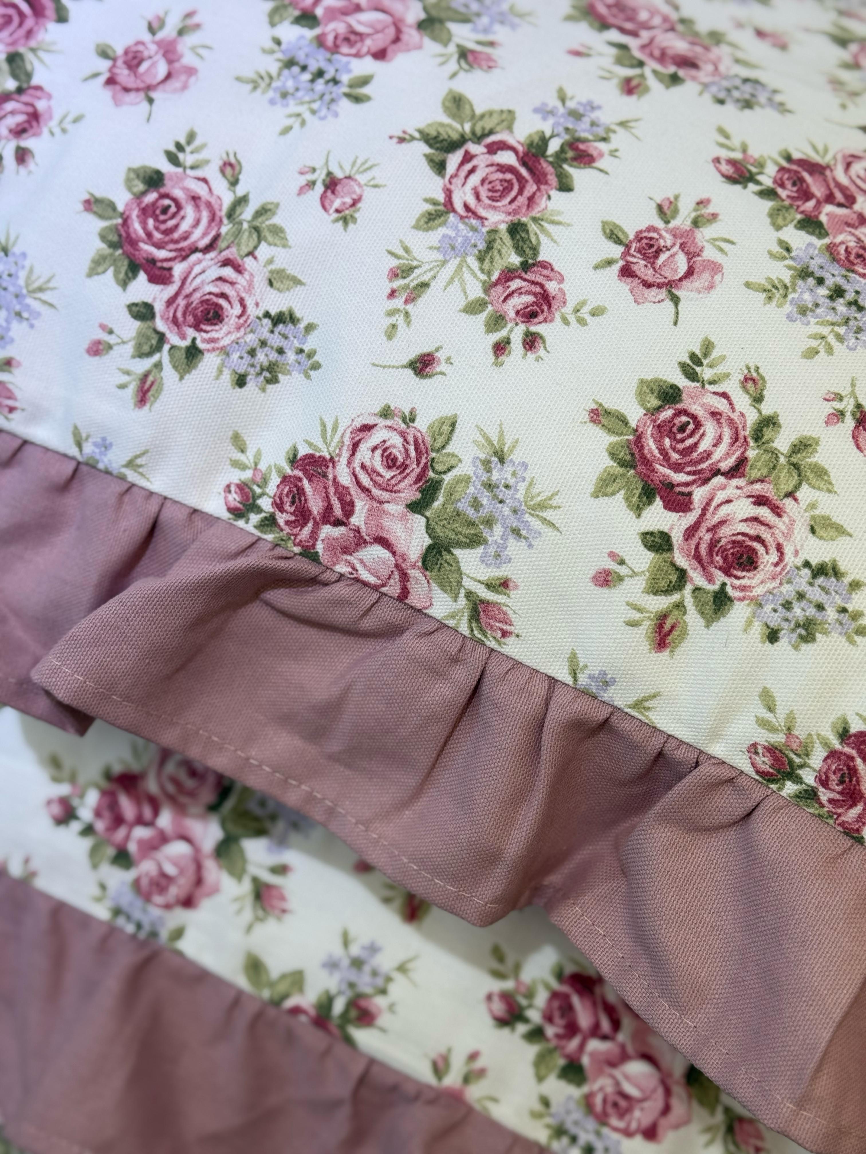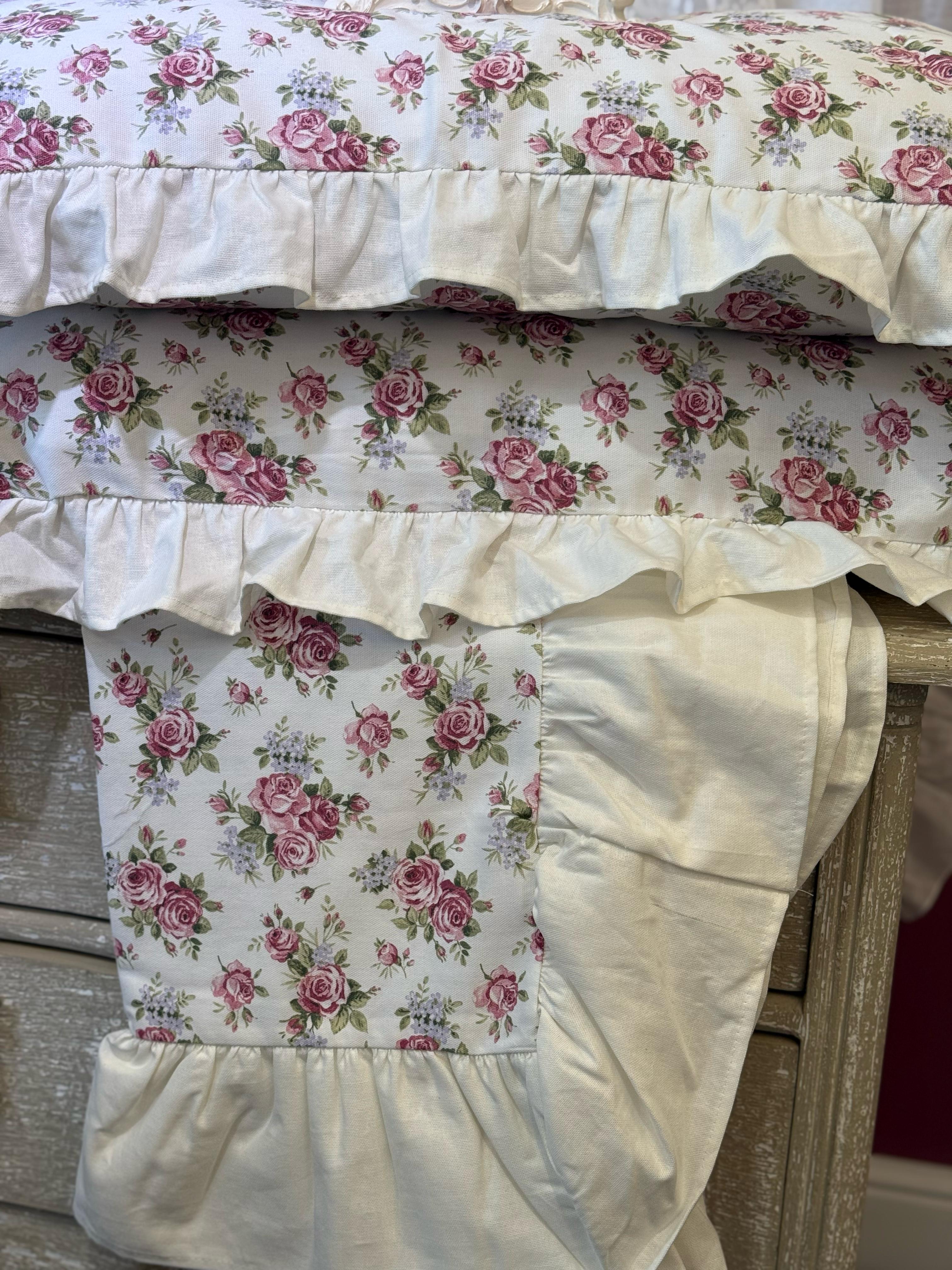 Copriletto sartoriale in panama con roselline e balza - 260x260 cm + 2 copriguanciali 50x80 cm - 3 varianti