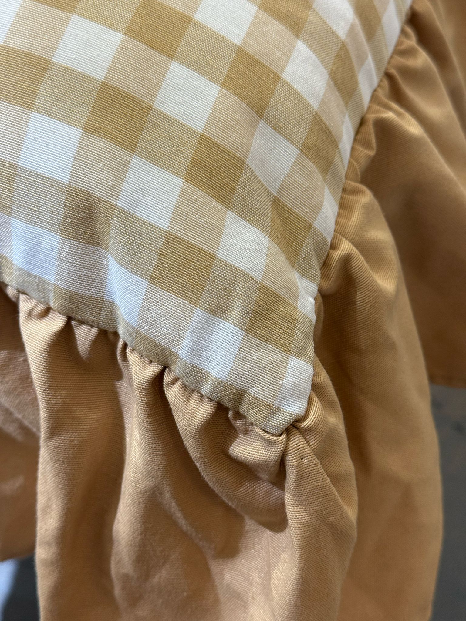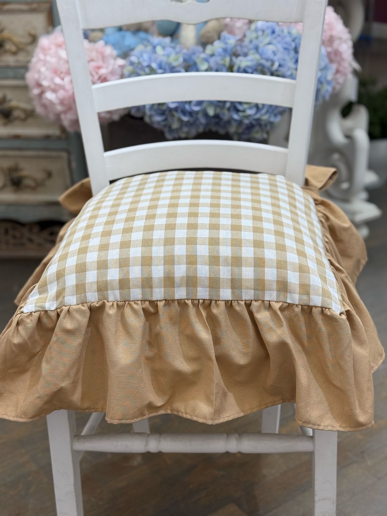 Cuscino da sedia sartoriale in cotone ocra a quadretti con balza tinta unita