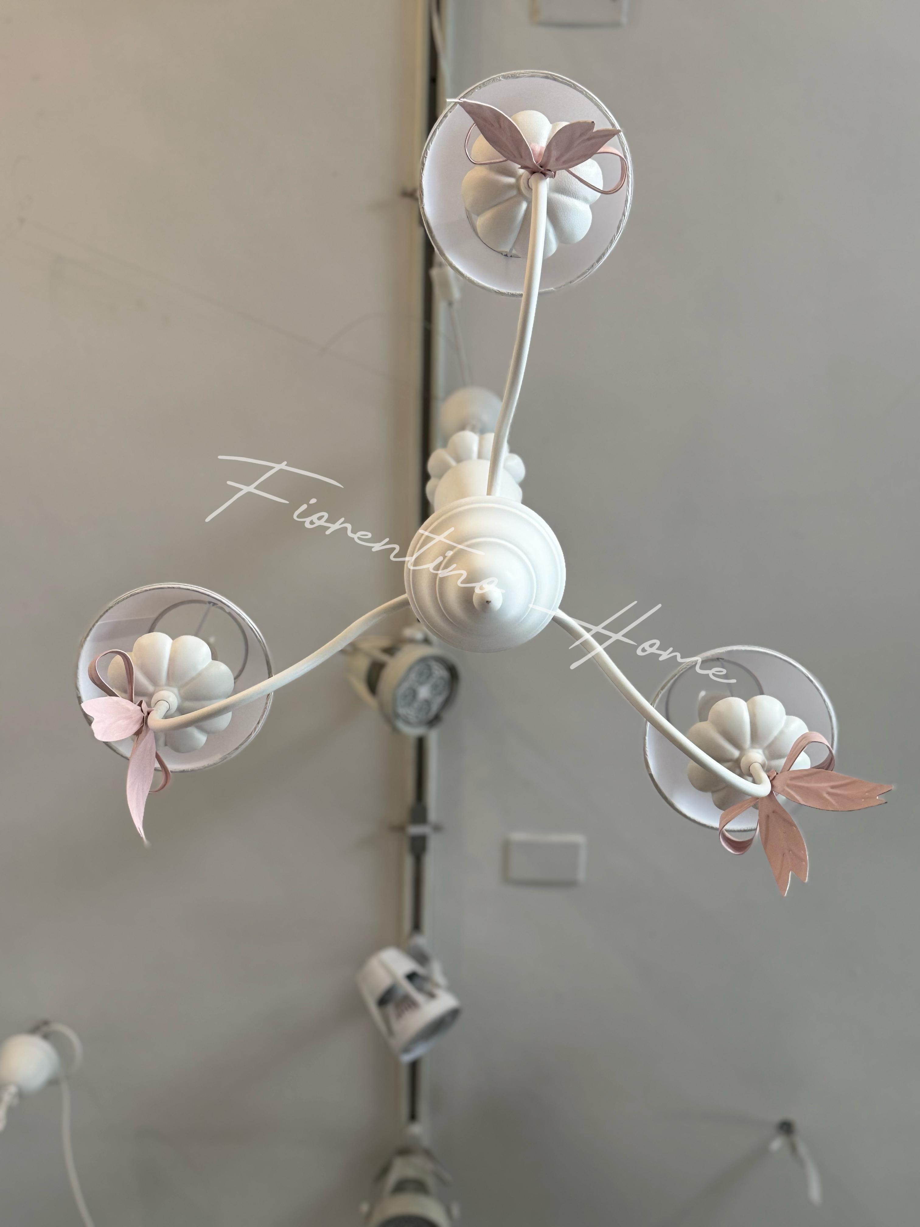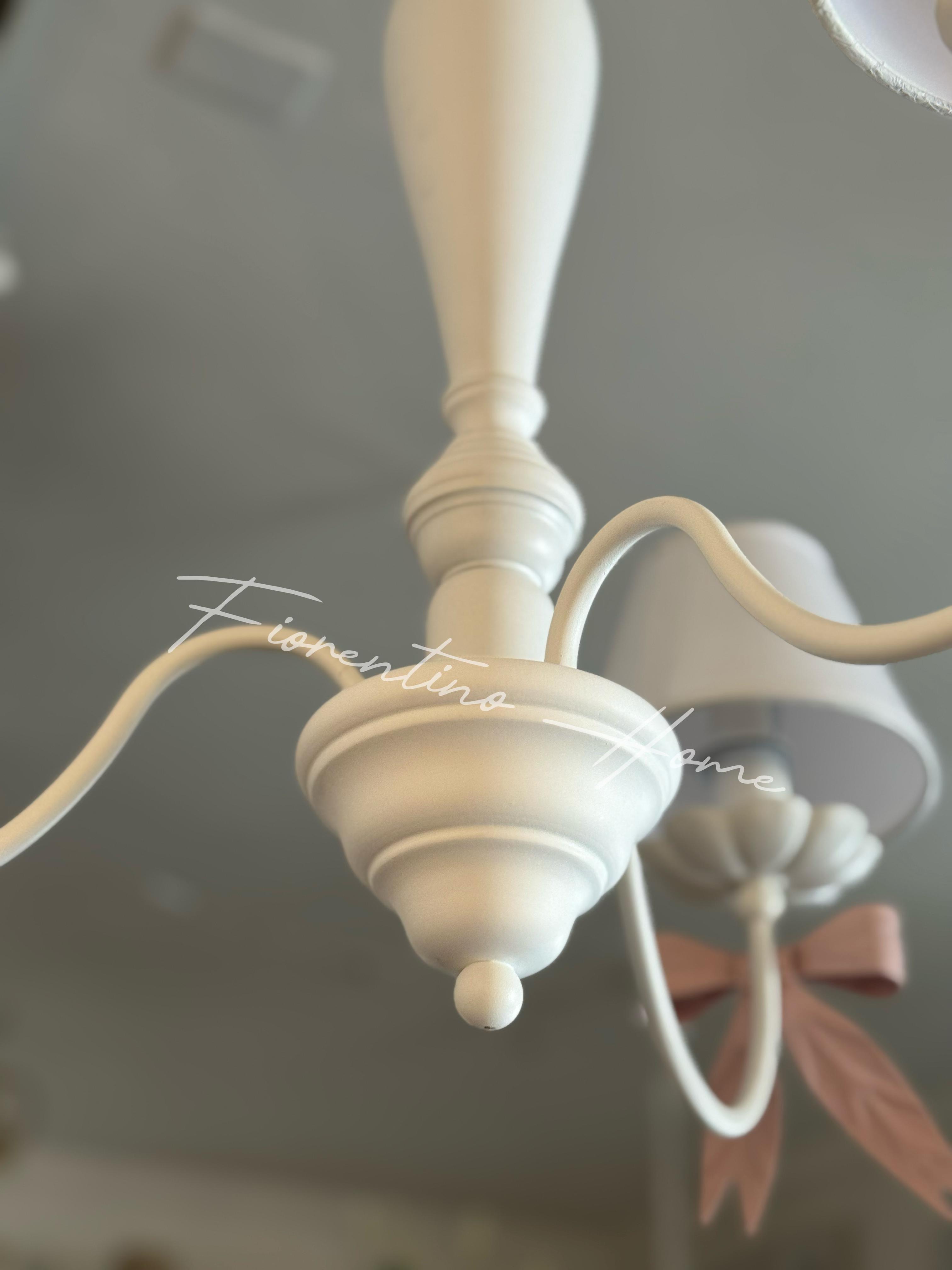 Lampadario con paralumi a 3 luci in legno e ferro c/fiocchi