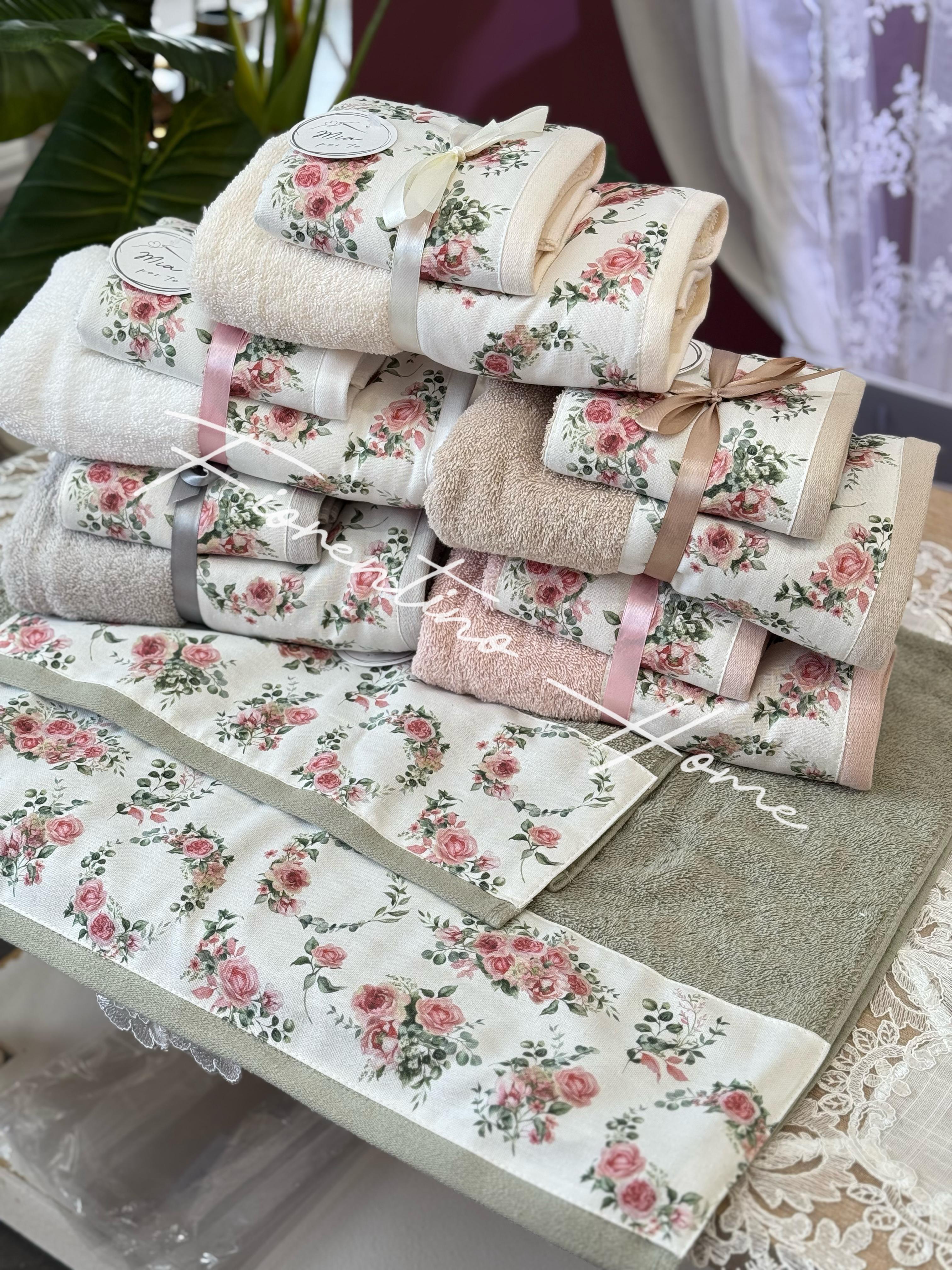 Raffinato set di asciugamani realizzato in 100% cotone, perfetto per aggiungere un tocco romantico ed elegante al tuo bagno. Ogni asciugamano è impreziosito da una fascia decorativa in tessuto floreale con delicate rose rosa e foglie verdi, rifinito con un nastro coordinato per una presentazione impeccabile.