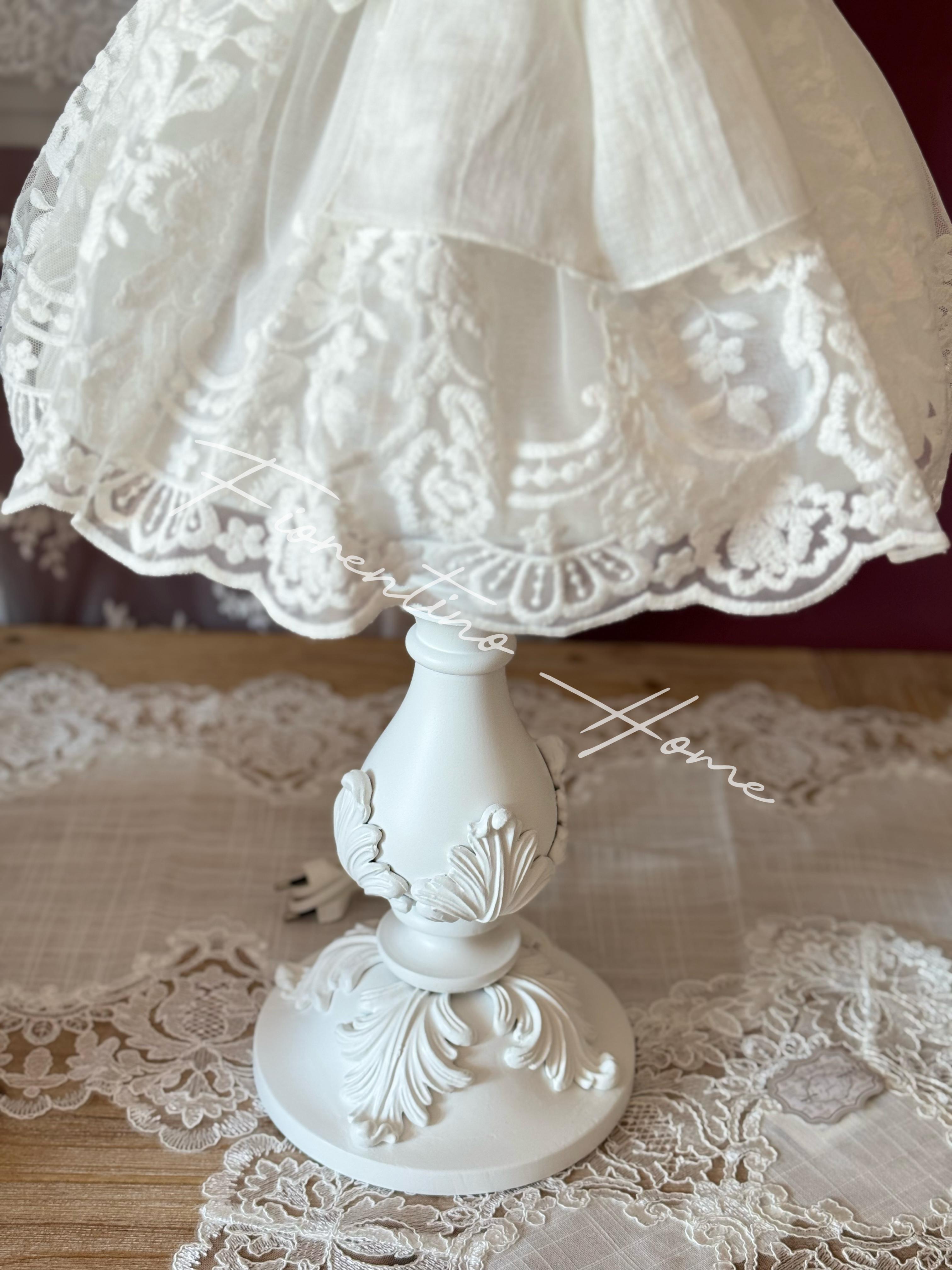 Una lampada da tavolo che racconta romanticismo e artigianalità in ogni dettaglio. La base in legno, arricchita da raffinati fregi intagliati, si unisce armoniosamente al paralume sartoriale in pizzo Royal, lavorato a mano con gusto e delicatezza.