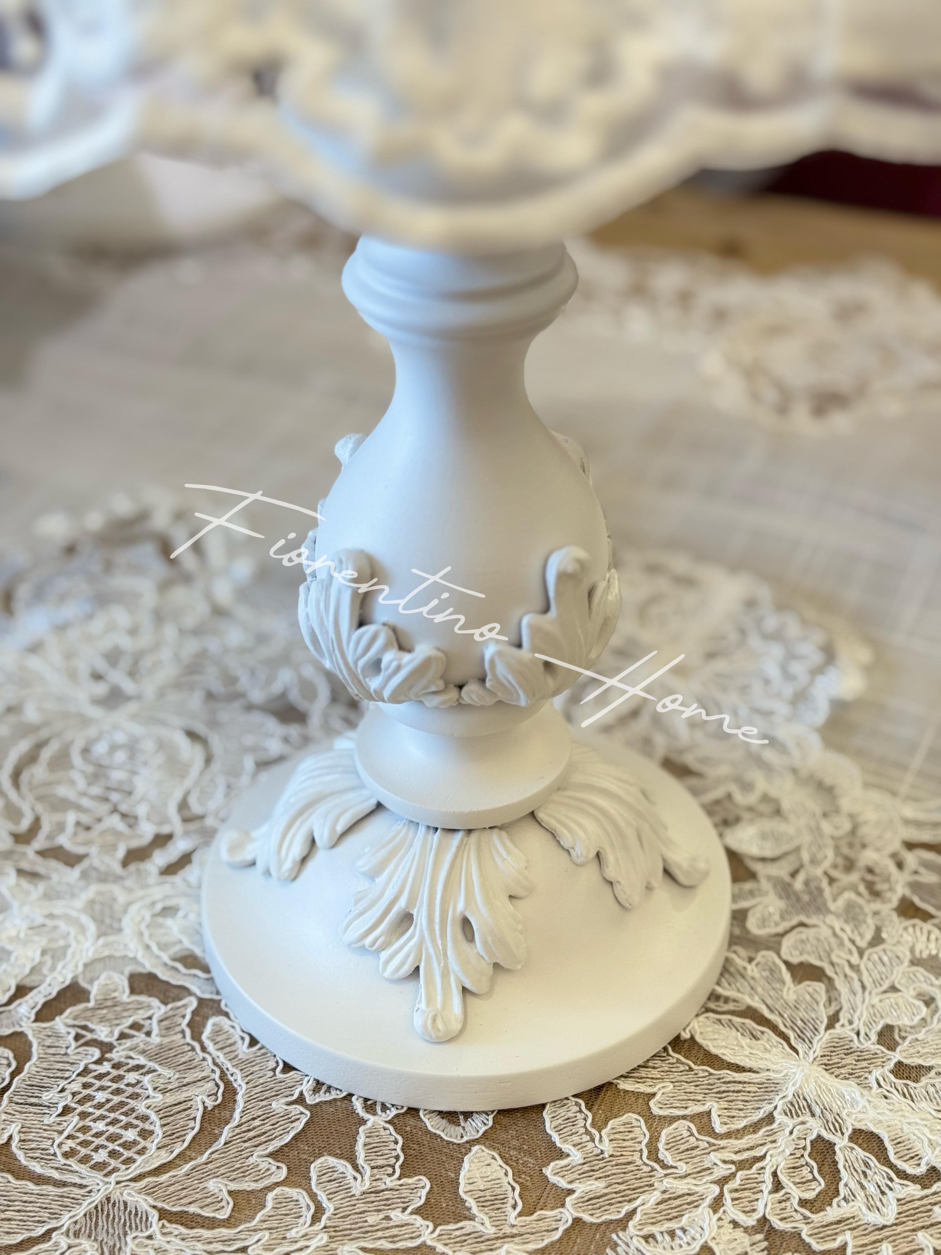 Una lampada da tavolo che racconta romanticismo e artigianalità in ogni dettaglio. La base in legno, arricchita da raffinati fregi intagliati, si unisce armoniosamente al paralume sartoriale in pizzo Royal, lavorato a mano con gusto e delicatezza.