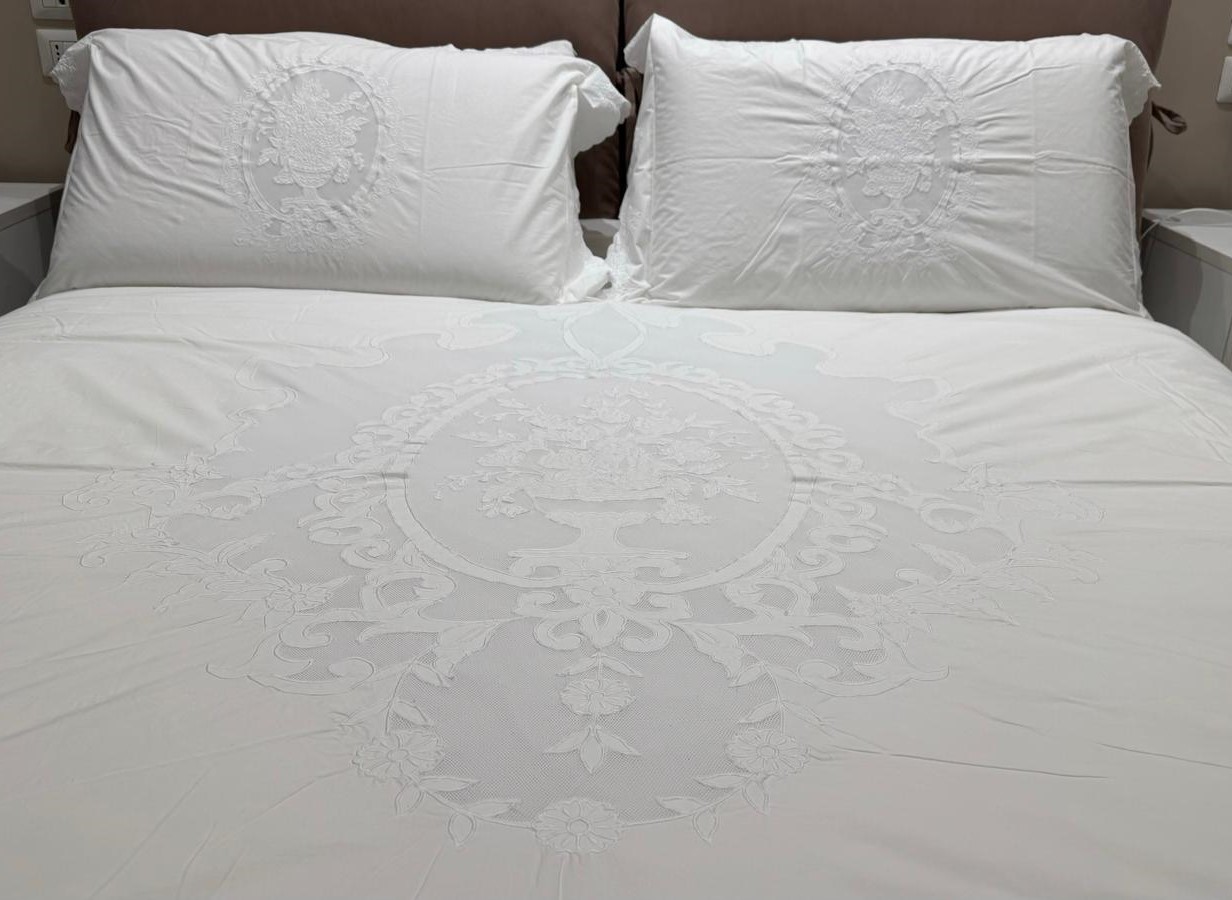 Copripiumino in puro cotone bianco con ricamo centrale + 2 copriguanciali 50x80 cm