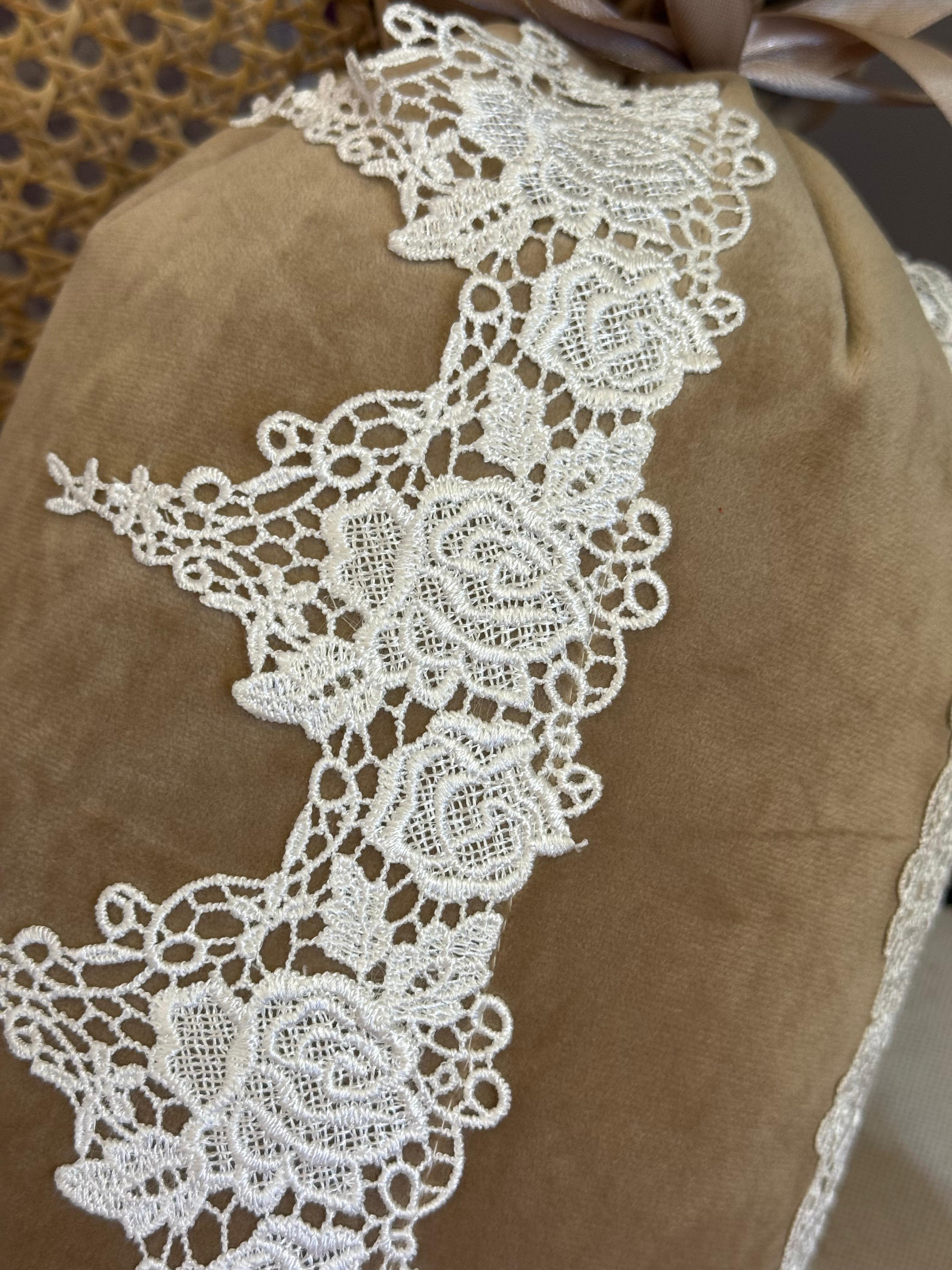 Cuscino caramella in velluto tortora con pizzo rebrode'